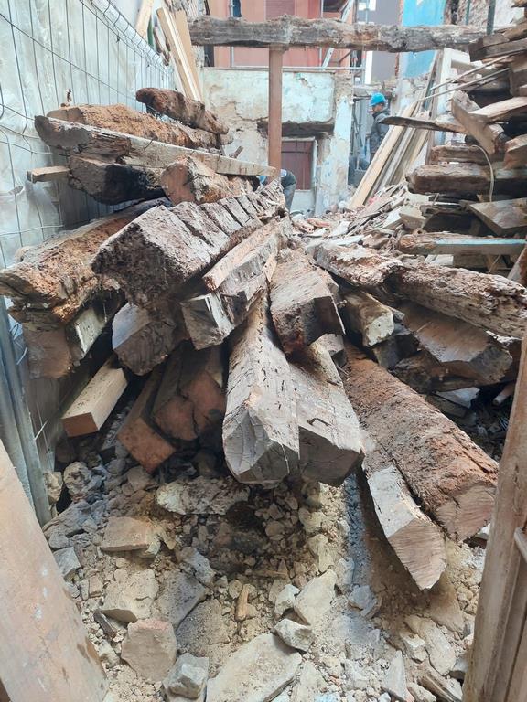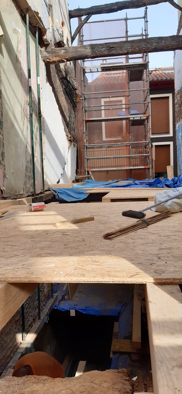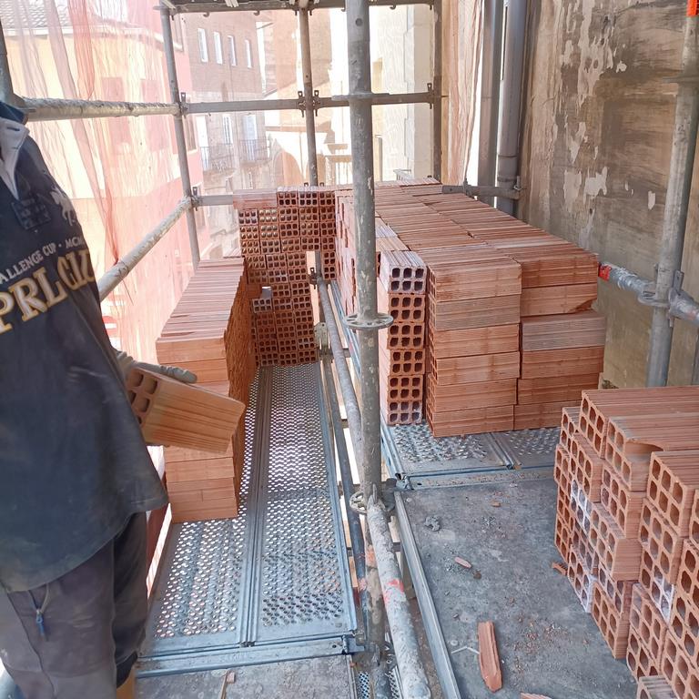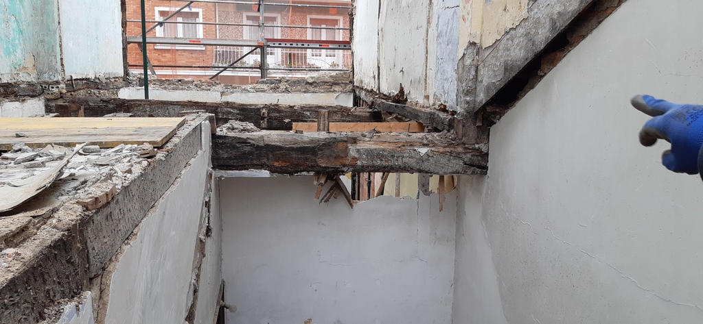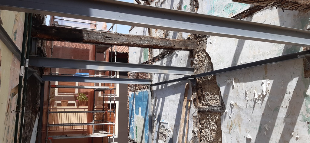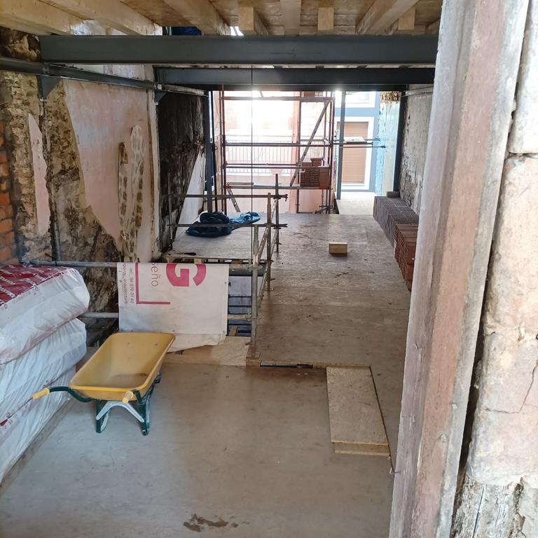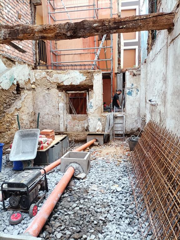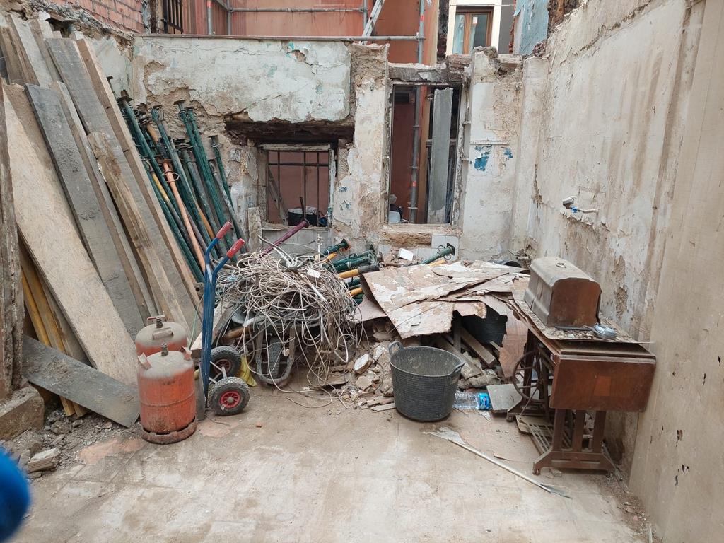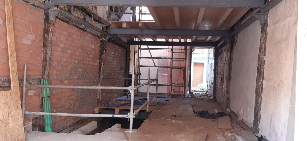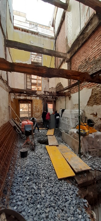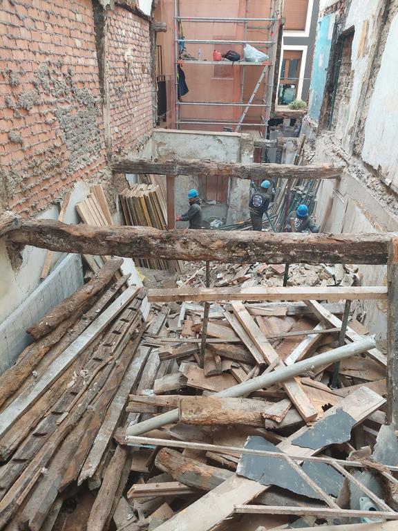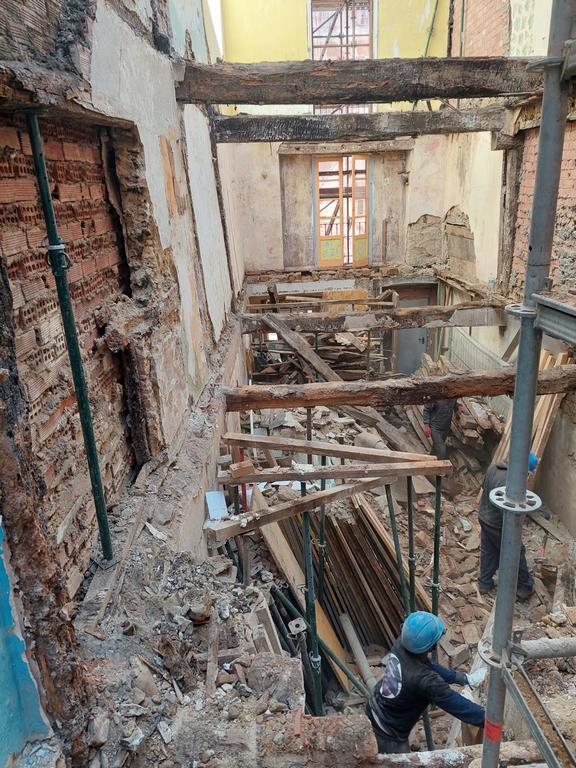 Para la realizacion de este proyecto se procede al vaciado del edificio y derrumbe da gran parte de la fachada y estructura oprobechando los elementos que estan en buen estado