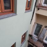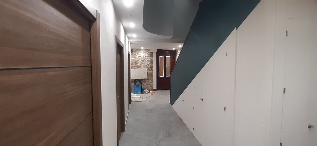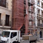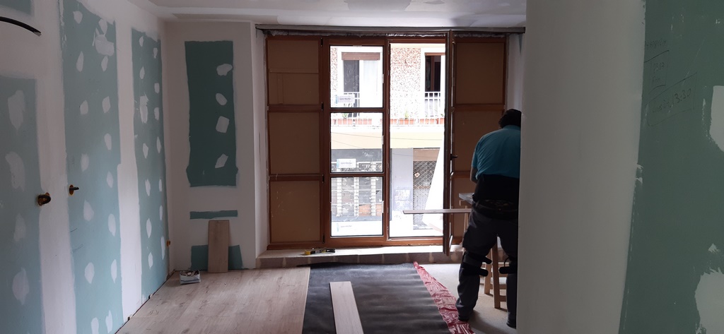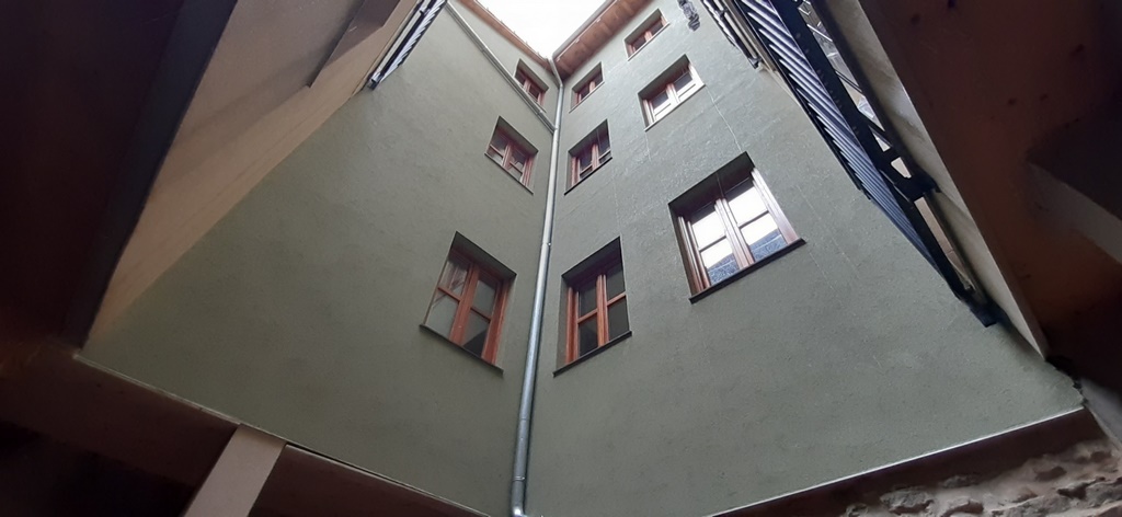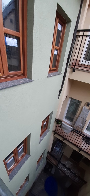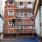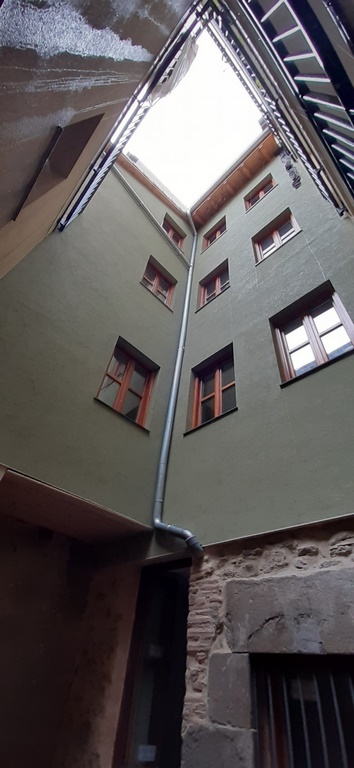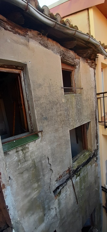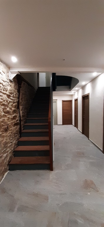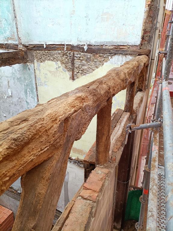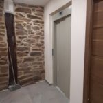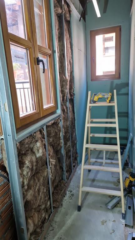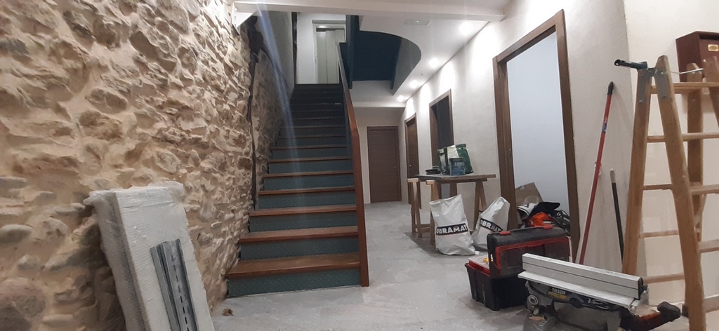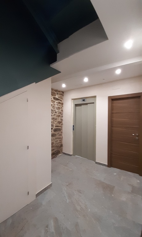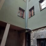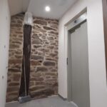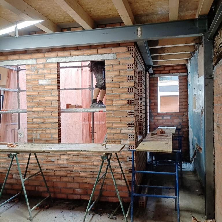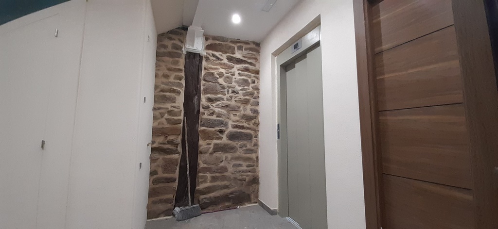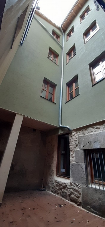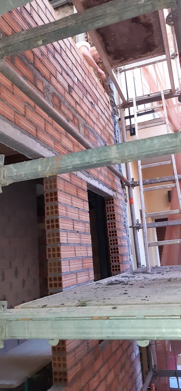 La fachada del edificio al patio interior se rehace completamente exceptuando la planta baja del patio en la cual se mantiene la manposteria de piedra natural, el resto de la fachada se formada por ladrillo ceramico media asta, camara de aire, aislamiento con lana de roca de 10cm y placa de carton yeso.