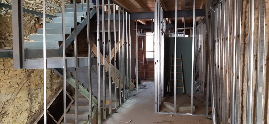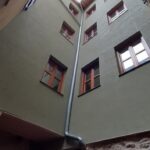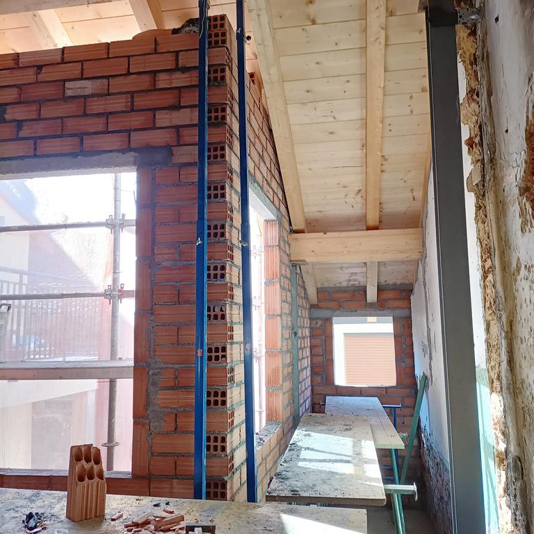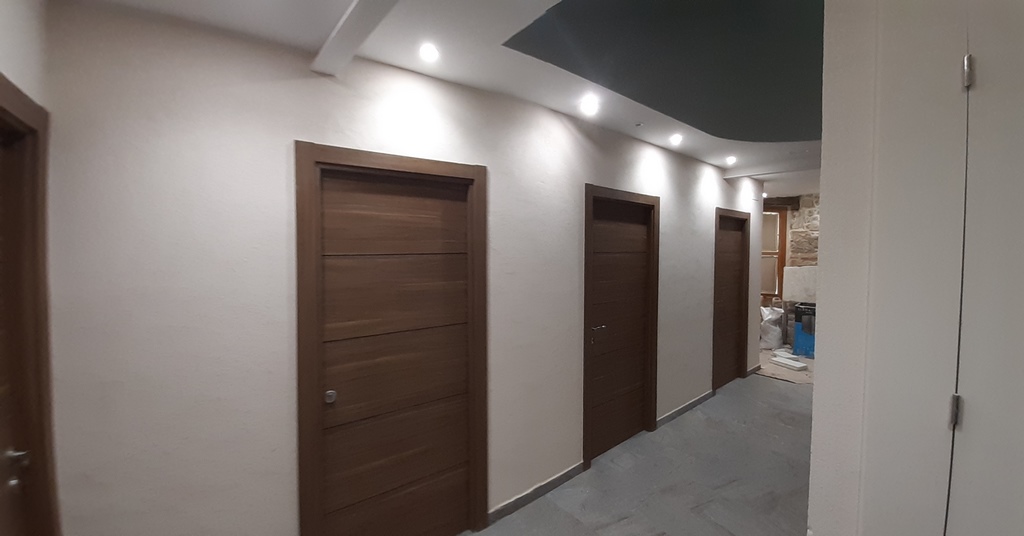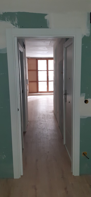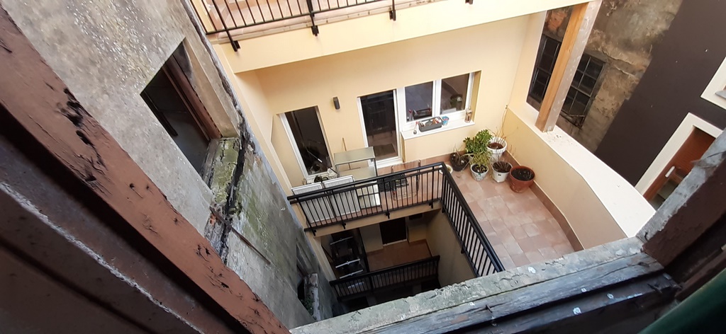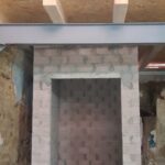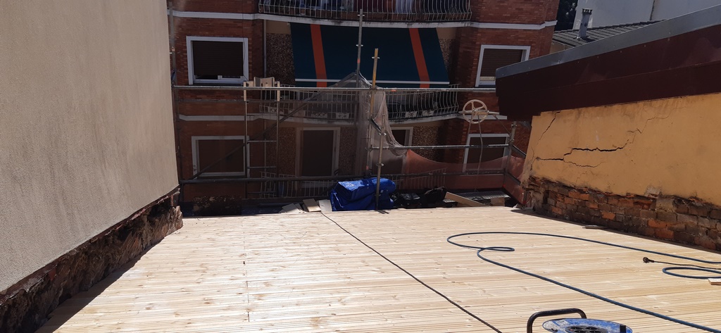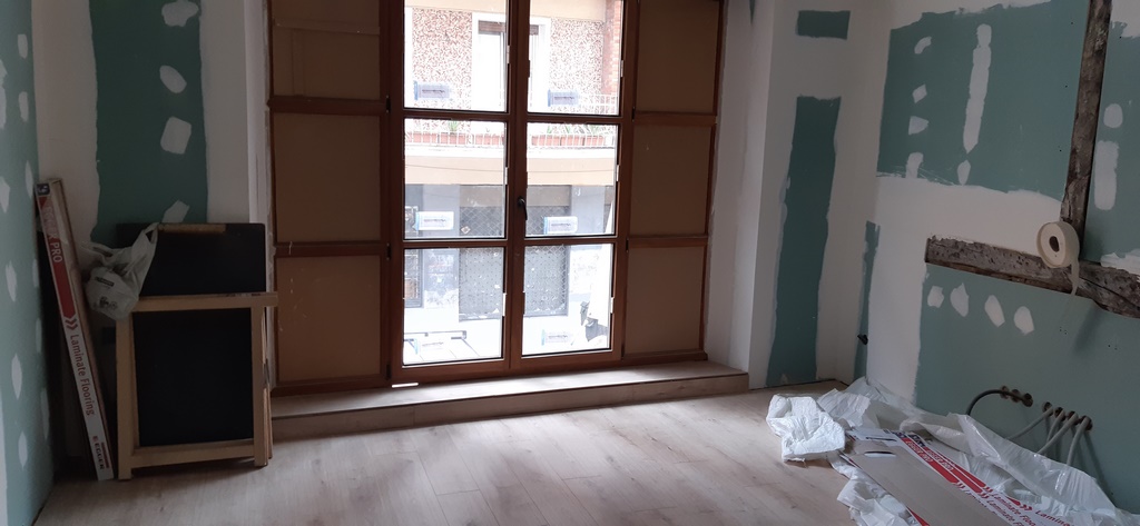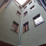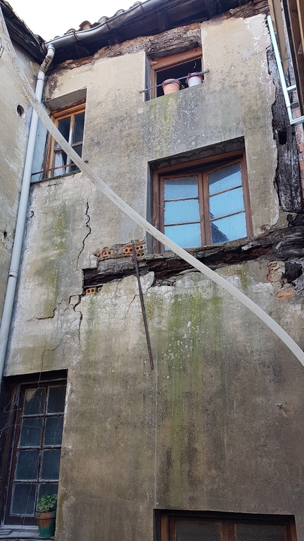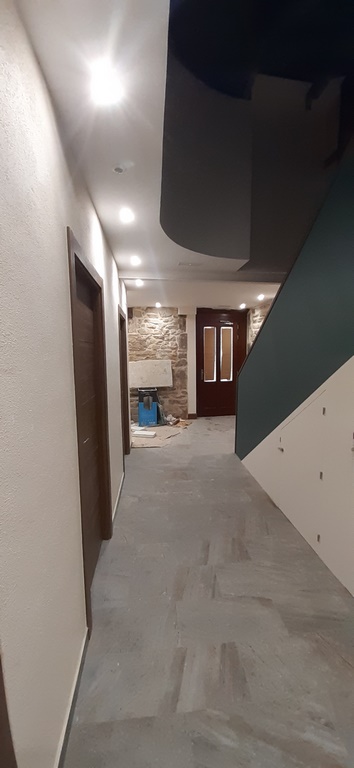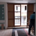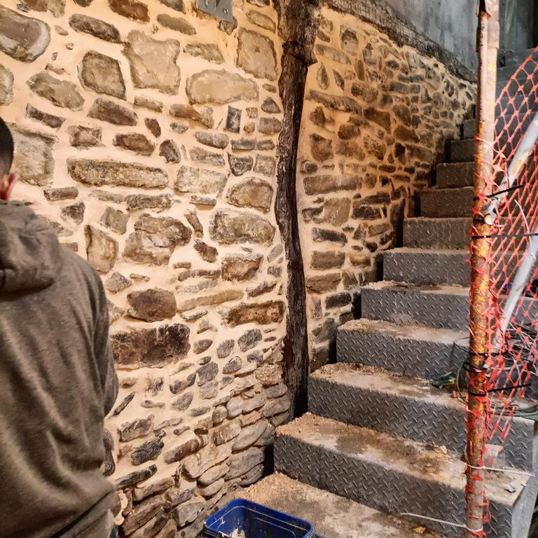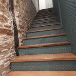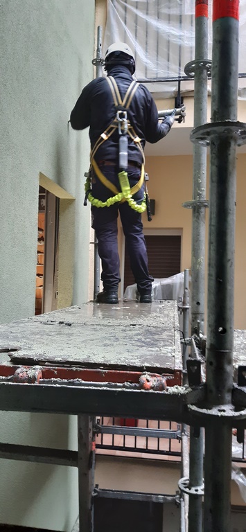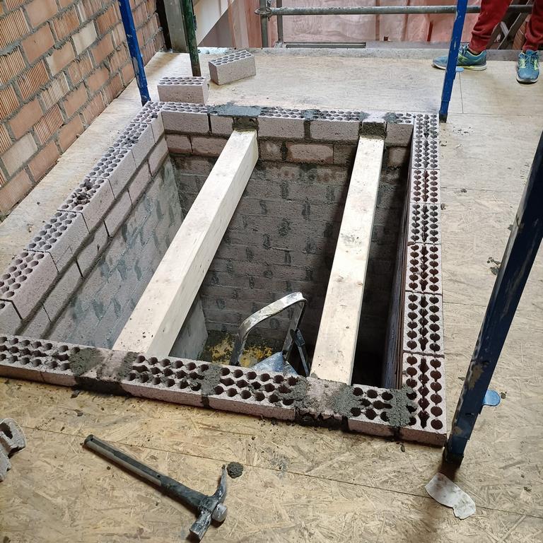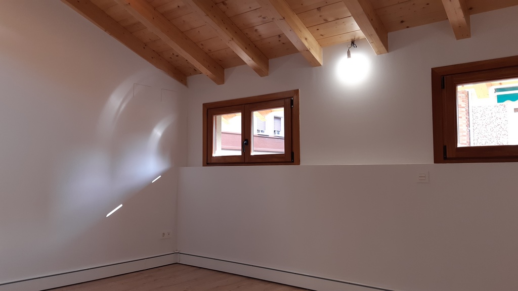 La fachada del edificio al patio interior se rehace completamente exceptuando la planta baja del patio en la cual se mantiene la manposteria de piedra natural, el resto de la fachada se formada por ladrillo ceramico media asta, camara de aire, aislamiento con lana de roca de 10cm y placa de carton yeso.