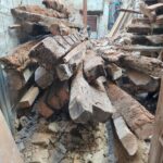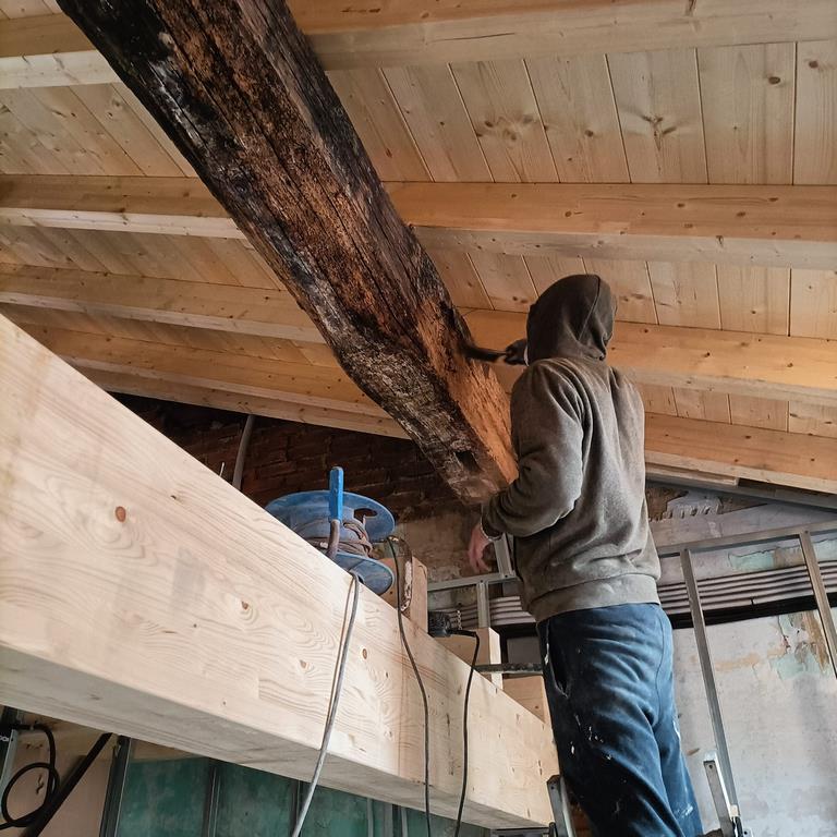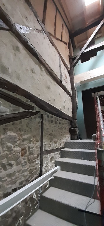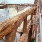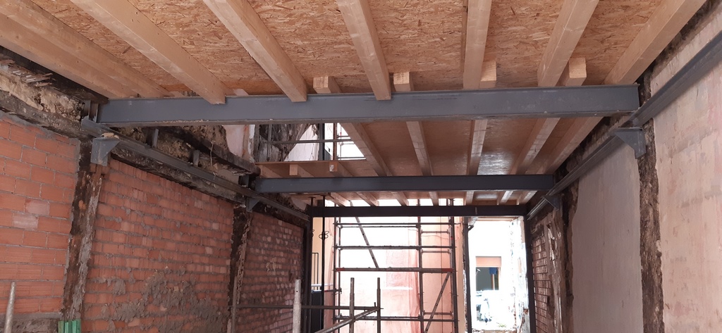 En la estructura del edificio se aprovechan los elemntos en buen estado tales como pilares y vigas de madera, combinandolos con vigas, pilares y mensulas de acero laminado.