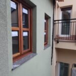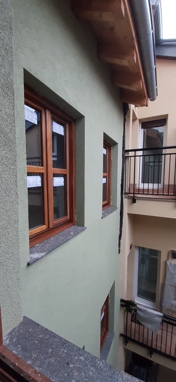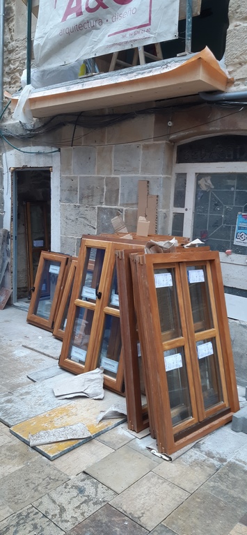Esta mantiene la sillería de planta baja y primera, realizando un enfoscado hidrofugo de cemento pintadoa cabado en revestimiento plastico transpirable para el resto de la fachada, dejano dinteles de madera barnizados vistos.