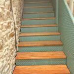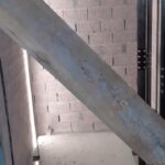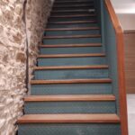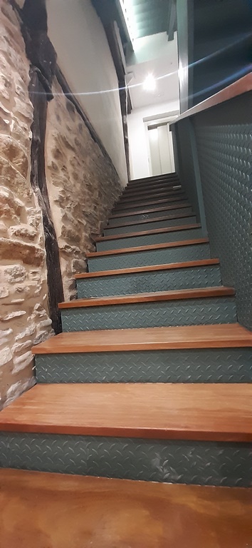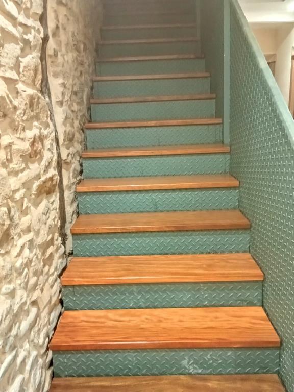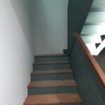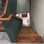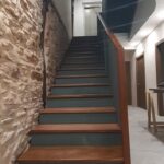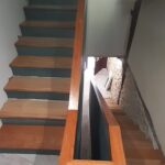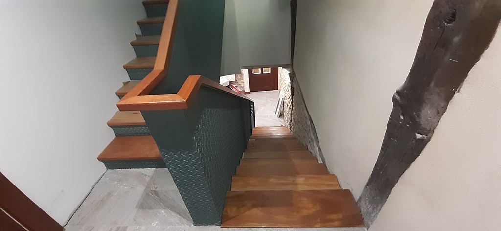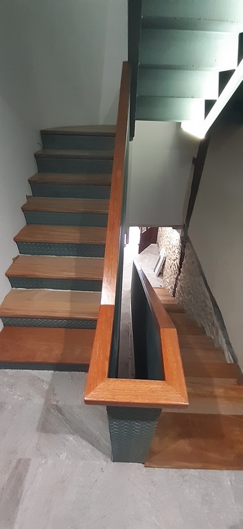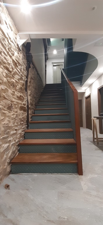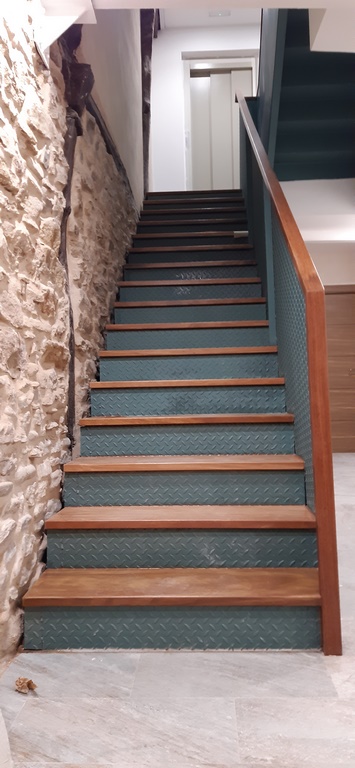La escalera se ha ejecutado mediante perfiles de acero y chapa estriada dandole un acabado para los escalones y barandilla de madera de guinea barnizada de alta calidad
