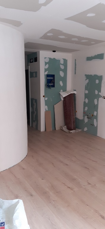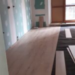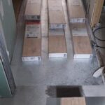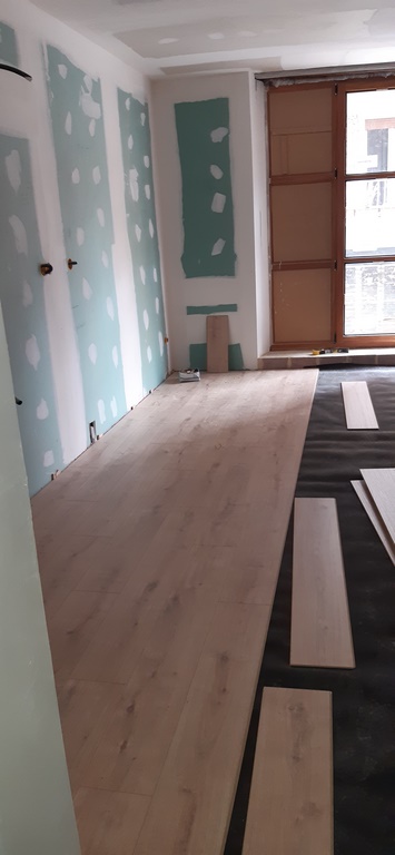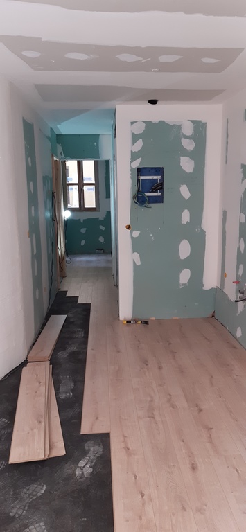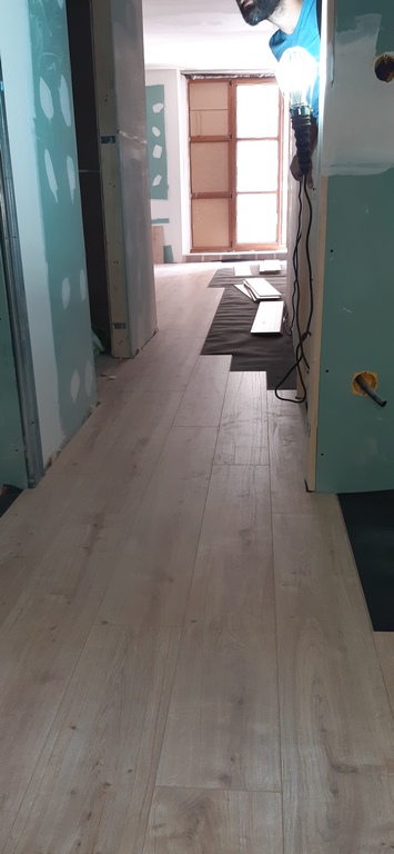 Los pavimentos interiores se han ejecutado con laminado Egger Aqua+ especialmente resistente y apropiado para zonas humedas mientras que en los pavimentos de los baños se usa una baldosa ceramica de gran calidaz antideslizante gres indiana.