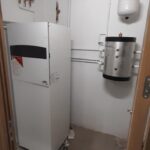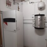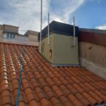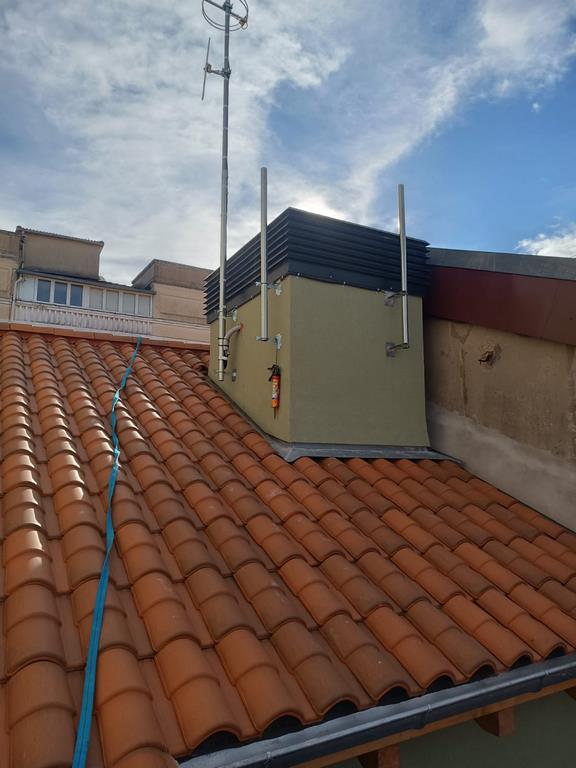 La produccion de aga caliente sanitaria y calefaccion se realiza mediante aerotermia, con unidad exterior en cubierta y acumulador comunitario.