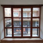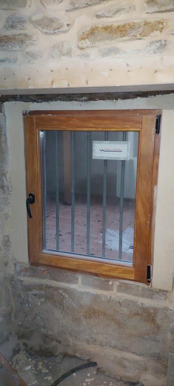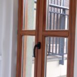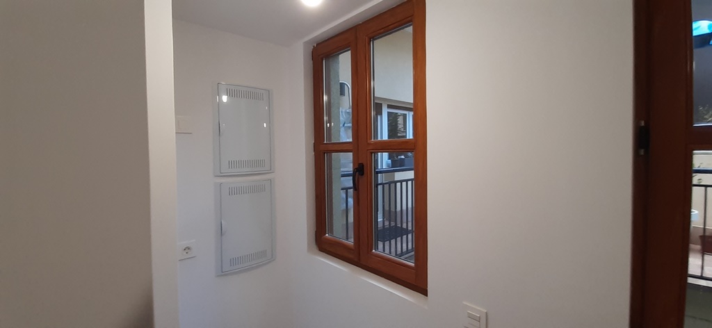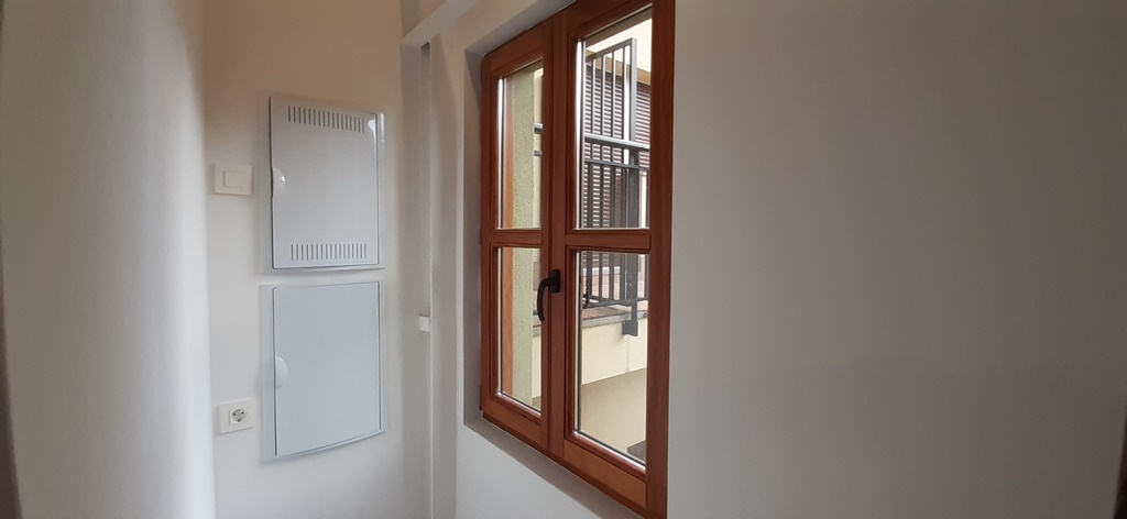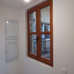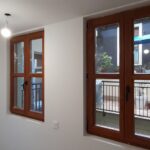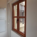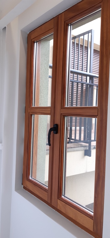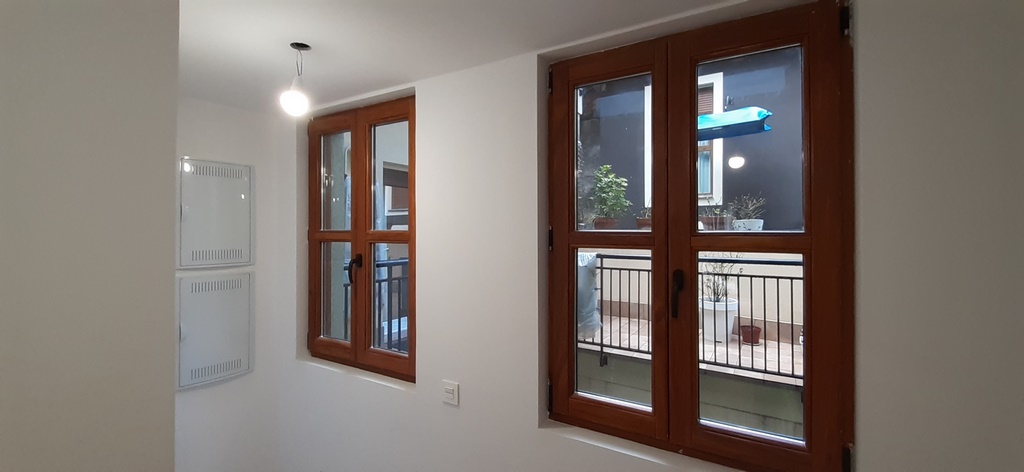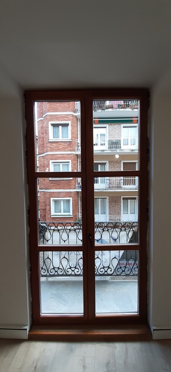Las carpinterias de las ventanas y balcones son de madera de guinea (elondo) barnizada logrando una gran robustez y sobriedad y garantizando una larga duración de estas.